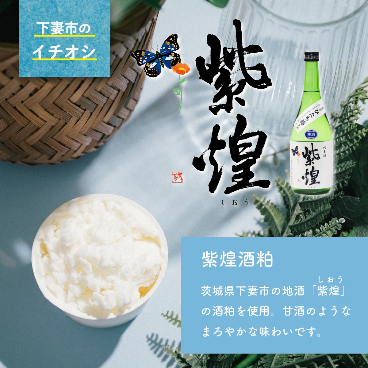 甘酒アイス … 下妻市地酒「紫煌(しおう)」の酒粕を使用。芳醇な香りとまろやかな口当たり。